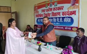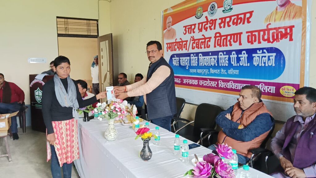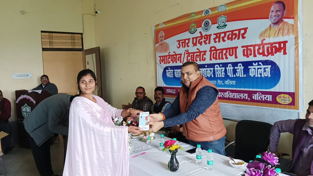 बिल्थरारोड। उत्तर प्रदेश सरकार द्वारा युवा सशक्तिकरण स्मार्टफ़ोन वितरण योजना के अंतर्गत रविवार को फतेह बहादुर सिंह शिवशंकर सिंह महाविद्यालय ससना बहादुरपुर में बीए, बीएससी , बीकॉम तृतीय वर्ष के छात्र – छात्राओं को ‘स्मार्टफ़ोन’ वितरित किया गया। इस मौके मुख्य अतिथि पूर्व प्रधान अजय सिंह ने कहा कि आधुनिक शिक्षा बिना स्मार्टफोन, टेबलेट और अन्य तकनीकी संसाधनों के बिना सम्भव नही है। छात्रों को इसका सदुपयोग करके शिक्षा के क्षेत्र में नया आयाम स्थापित करना चाहिए। इसके दुरुपयोग से बचने की अपील किया। महाविद्यालय के प्रबंधक रविशंकर सिंह पिक्कू ने छात्रों को बधाई देते हुए छात्रों को उच्चशिक्षा के लिए मोबाइल और टैबलेट का सकारात्मक प्रयोग करने के लिए प्रेरित किया। कहा कि इस योजना से लाभान्वित सभी छात्र अब डिजिटल दुनिया से जुड़कर अपनी शिक्षा संबंधी समस्याओं के साथ खुद को और ज्यादा सशक्त व आत्मनिर्भर बना सकेंगे। इस मौके पर महाविद्यालय के उपप्रबंधक विवेक सिंह परिहार, प्राचार्या डॉ अरुणा पाल, जमील अहमद,विपिन गुप्ता, अनवर, संजय सिंह, सुग्रीव राम, सोनू यादव, तेजबहादुर, प्रियंका सिंह, प्रभात, जगदीश, राजेश, प्रियंका गुप्ता, मुकेश पंकज सहित कर्मचारीगण उपस्थित रहे।