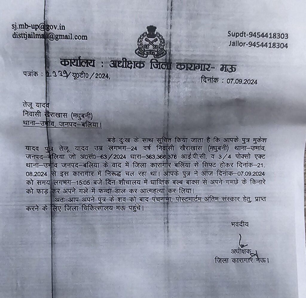 उभांव थाना क्षेत्र के खैराखास निवासी पास्को एक्ट में मऊ जिला जेल में बंद युवक ने गमछे के सहारे फांसी लगाकर जीवन ईहलीला समाप्त कर लिया