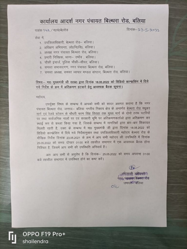बिल्थरारोड। नगर के मधुबन मार्ग, रेलवे स्टेशन से चौधरी चरण सिंह तिराहा और सार्वजनिक नाला पर अतिक्रमणकारियों द्वारा स्थाई रूप अतिक्रमण करने पर मुख्यमंत्री योगी आदित्यनाथ द्वारा बीते 18 मई को कांफ्रेंसिंग के माध्यम से दिए गए निर्देश के क्रम में अतिक्रमण हटाने के लिए आगामी 25 मई दिन बुधवार को अपराहन 1 बजे तहसील सभागार में उपजिलाधिकारी राजेश गुप्त के नेतृत्व में एक बैठक आयोजित की गई है । इसकी जानकारी नगर पंचायत के अधिशासी अधिकारी ब्रजेश गुप्त ने देते हुए बताया कि जिसमे अधीक्षण अभियंता लोकनिर्माण विभाग, नगर पंचायत अध्यक्ष, प्रभारी निरीक्षक उभांव, चौकी इंचार्ज सीयर, सभासद , व्यापार मंडल अध्यक्ष की उपस्थिति में किया जायेगा।