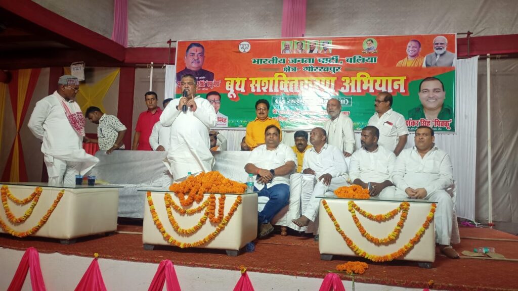 बिल्थरारोड। भारतीय जनता पार्टी गोरखपुर क्षेत्र के सलेमपुर लोकसभा चुनाव के मद्देनजर नगर के राधिका मैरेज हाल में गुरुवार को बूथ सशक्तिकरण अभियान के तहत मण्डल अध्यक्ष, बूथ अध्यक्ष व अन्य पदाधिकारियों की एक बैठक आयोजित की गई। बैठक का शुभारंभ मुख्य अतिथि एमएलसी रविशंकर सिंह पप्पू ने श्यामा प्रसाद मुखर्जी व पण्डित दीनदयाल उपाध्याय के तैल चित्र पर पुष्प अर्पित कर व दीप प्रज्वलित कर किया। बैठक को सम्बोधित करते हुए एमएलसी पप्पू सिंह ने कहा कि आगामी लोक सभा चुनाव को देखते हुए पार्टी के सभी पदाधिकारियों और कार्यकर्ताओं को अपने अपने बूथ पर लग जाय। जिस बूथ पर पार्टी कमजोर है। वहाँ पर बूथ अध्यक्ष और अन्य सभी कार्यकर्ता एक एक मत सहेजने में लग जाय। वही नगर चेयरमैन दिनेश कुमार गुप्त ने कहा कि 2024 के लोकसभा चुनाव में भाजपा सभी सीटों पर परचम लहराने के लिए सभी कार्यकर्ता और पदाधिकारी लग जाय। इस मौके पर रविशंकर सिंह पिक्कू ,जितेंद्र सिंह, दिपु सिंह ,अरविंद सिंह, दिलीप सिंह, मण्डल अध्यक्ष शशिप्रकाश चौरसीया , पंकज मिश्र, आलोक गुप्ता,दिनेश्वर सिंह , मृत्युंजय गुप्ता, अरून कुमार तिवारी ,राम मनोहर गांधी, छट्ठू सिंह , रणजीत कुशवाहाआदि मौजूद रहे। कार्यक्रम की अध्यक्षता सतीश कुमार गुप्ता व संचालन प्रमोद सिंह ने किया।