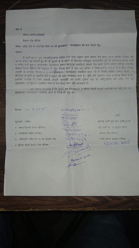 नगर के वार्ड नम्बर 13 में अवैध रूप से बूचड़खाना चलाने वाले के खिलाफ एसडीएम, सीओ, ईओ को शिकायती पत्र