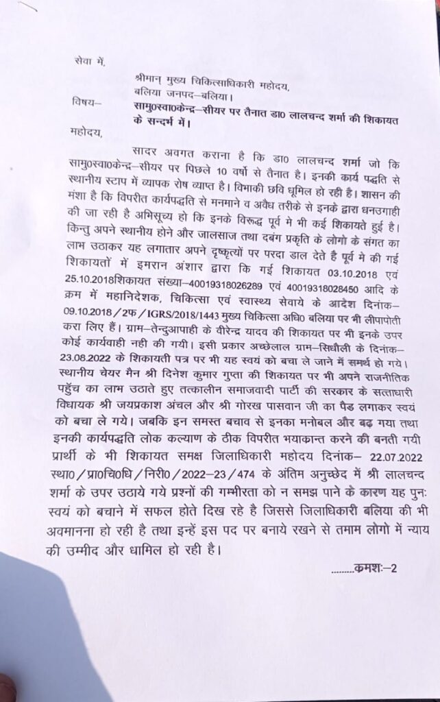 सीएचसी सीयर पर तैनात डॉक्टर एलसी शर्मा के खिलाफ शिकायती पत्र देकर करवाई की मांग