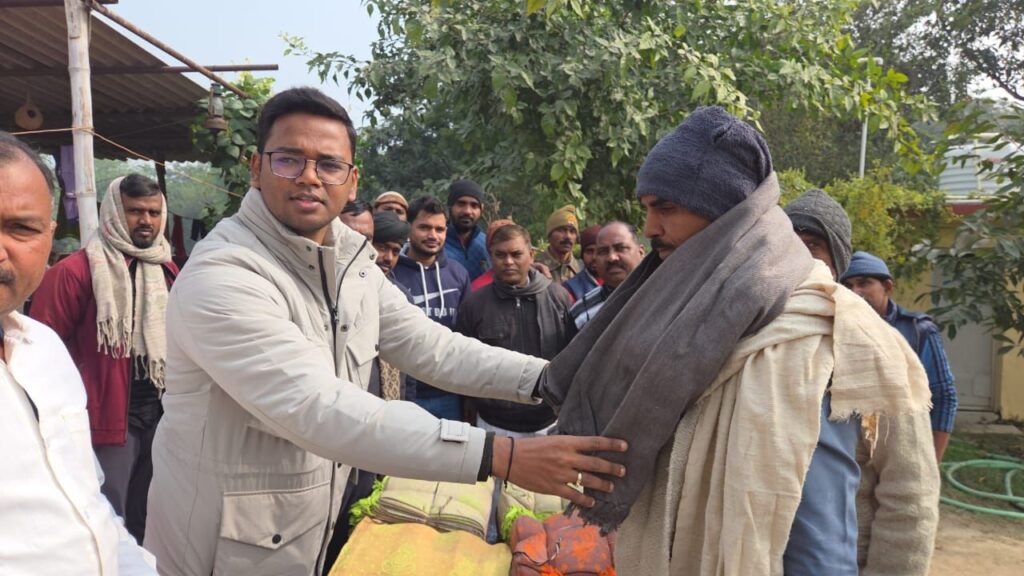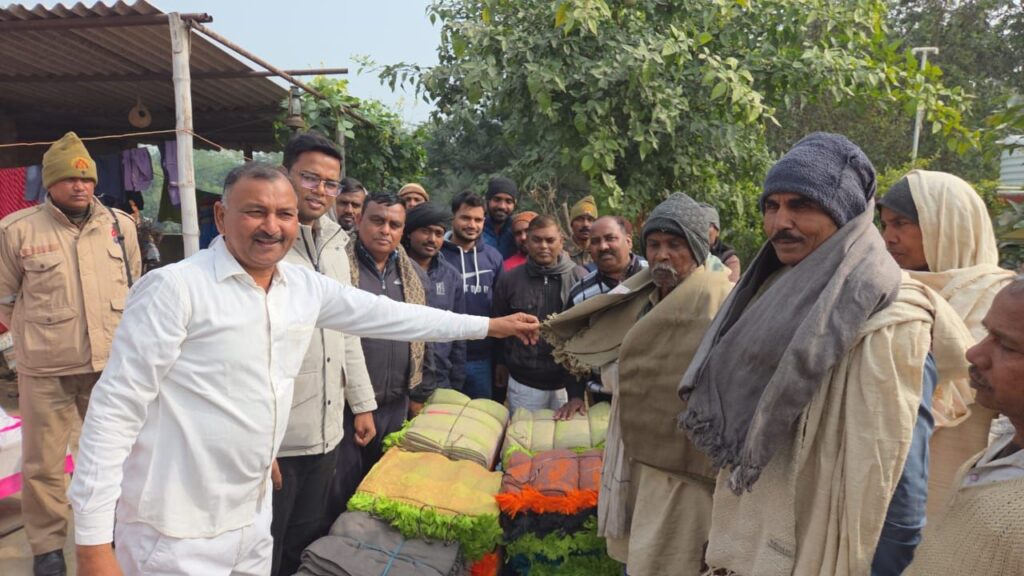 ठंड को लेकर मुबारकपुर के ग्रामप्रधान रामभवन यादव ने जरूरतमंदों को 500 कम्बल,300 साल व 300 टोपी वितरित किया