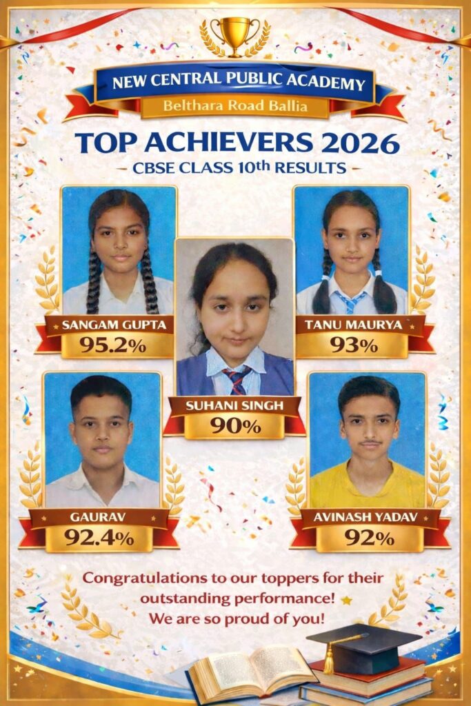 न्यू सेंट्रल पब्लिक अकैडमी, बेल्थरा रोड के छात्र-छात्राओं ने CBSE कक्षा 10वीं बोर्ड परीक्षा 2026 में उत्कृष्ट प्रदर्शन करते हुए विद्यालय और क्षेत्र का नाम रोशन किया है। इस वर्ष विद्यालय का परीक्षा परिणाम अत्यंत सराहनीय रहा, जिससे पूरे इलाके में खुशी और उत्साह का माहौल है।