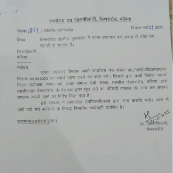 तहसीलदार के पेशकार द्वारा घुस लेने के वायरल वीडियो के मामले में उपजिलाधिकारी की जांच में पाए गए दोषी, गिर सकती है गाज।