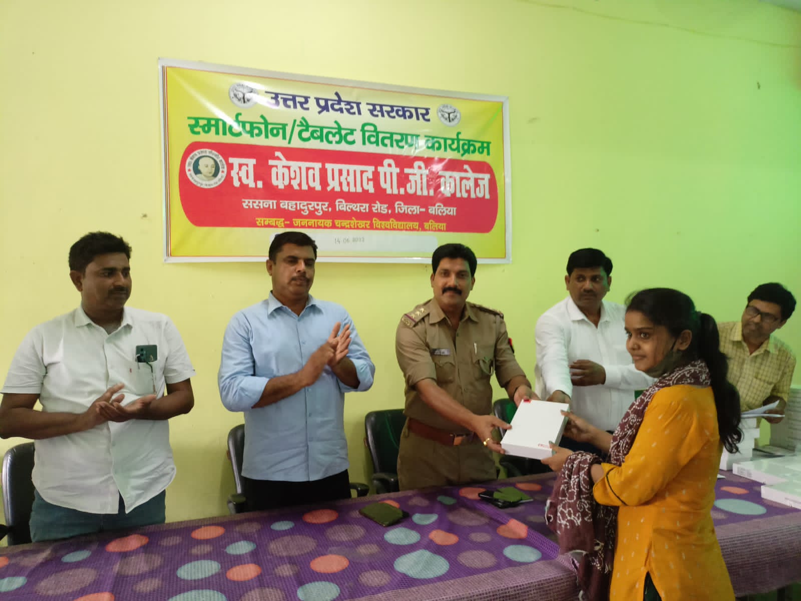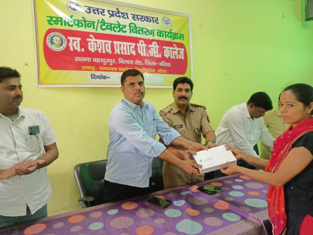 बिल्थरारोड। क्षेत्र के ससना बहादुरपुर स्थित स्व0 केशव प्रसाद महाविद्यालय में मंगलवार को चयनित 32 छात्रों के बीच टैबलेट का वितरण किया गया। महाविद्यालय के व्यवस्थापक राजेन्द्र प्रताप सिंह की मौजूदगी में मुख्य अतिथि इंस्पेक्टर उभांव अविनाश कुमार सिंह और प्रबन्धक इन्द्रप्रताप सिंह इन्नू ने संयुक्त रुप से छात्रों को मोबाइल और टैबलेट वितरित किया। इंस्पेक्टर अविनाश कुमार सिंह ने कहा कि आधुनिक शिक्षा बिना टेबलेट और अन्य तकनीकी संसाधनों के बिना सम्भव नही है। छात्रों को इसका सदुपयोग करके शिक्षा के क्षेत्र में नया आयाम स्थापित करना चाहिए। इसके दुरुपयोग से बचने की अपील किया। प्रबन्धक इन्द्रप्रताप सिंह इन्नू ने छात्रों को बधाई देते हुए छात्रों को उच्चशिक्षा के लिए मोबाइल और टैबलेट का सकारात्मक प्रयोग करने के लिए प्रेरित किया। इस मौके पर टेबलेट वितरण समारोह के प्रवक्ता बेचन यादव,एसआई योगेश यादव, सन्त जी, झुनझुन यादव, कैलास, दिनेश यादव, सन्तोष सिंह, विनोद गुप्ता, शैलेन्द्र सिंह आदि सहित छात्र / छात्राए मौजूद रहे।