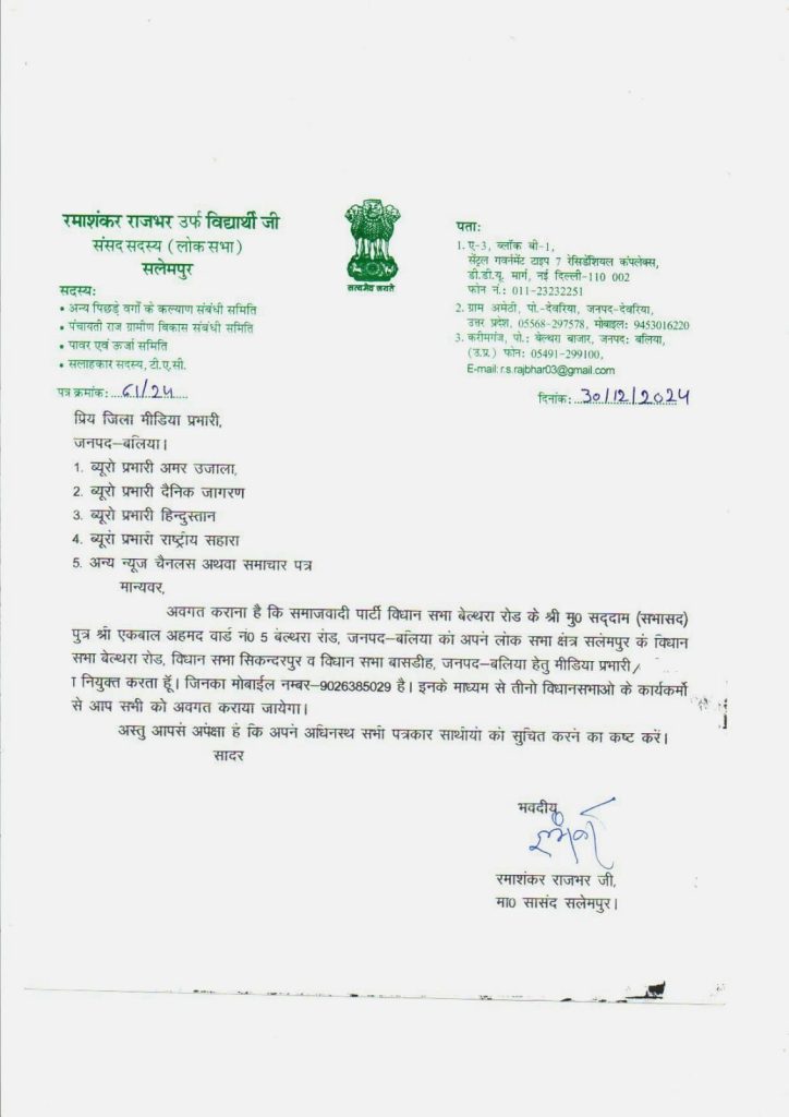 बिल्थरारोड। सलेमपुर लोकसभा के सांसद रमाशंकर राजभर द्वारा नगर के वार्ड नम्बर 5 के सभासद मोहम्मद सद्दाम पुत्र इकबाल अहमद को मीडिया प्रभारी बनाये जाने पर कार्यकर्ताओं में खुशी व्याप्त है। मोहम्मद सद्दाम लोकसभा सलेमपुर के तीन विधानसभा बेल्थरारोड, सिकंदरपुर और बांसडीह में होने वाले विभिन्न कार्यक्रमों की जानकारी देंगे। सांसद द्वारा मीडिया प्रभारी बनाये जाने पर मोहम्मद सद्दाम ने कहा कि जो जिम्मेदारी मिली है उसका पार्टी के वफादार सिपाही के रूप में बखूबी निर्वहन करूँगा।
