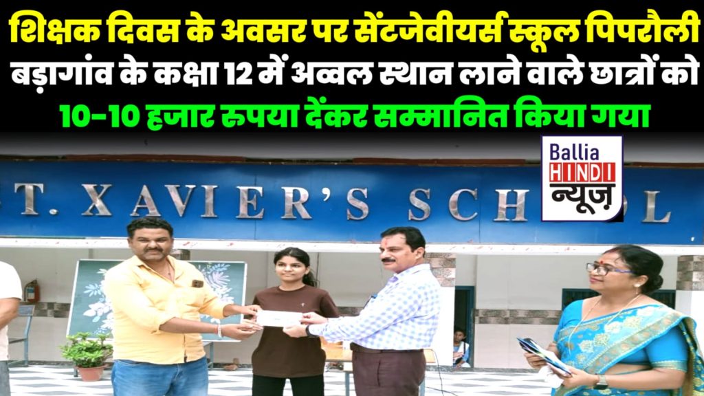 शिक्षक दिवस के अवसर पर सेंटजेवीयर्स स्कूल पिपरौली बड़ागांव के कक्षा 12 में अव्वल स्थान लाने वाले छात्रों को विद्यालय के डायरेक्टर व प्रिंसिपल द्वारा 10-10 रुपये का चेक देंकर सम्मानित किया गया