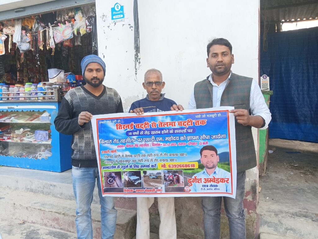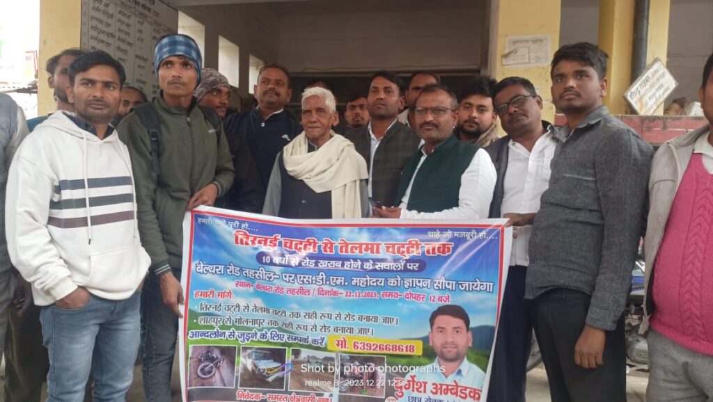 बिल्थरारोड। क्षेत्र के तिरनई चट्टी और शाहपुर से होकर गुजरने वाले सभी संपर्क मार्ग गढ्ढे में तब्दील होने के एक दशक बाद भी जनप्रतिनिधियों की उपेक्षा के चलते सड़के अपनी बदहाली पर आंसू बहा रही हैं। सड़कों पर आवागमन दुरूह बन गया है । इसको लेकर छात्र नेता दुर्गेश अम्बेडकर के नेतृत्व में दर्जनों लोगों ने शुक्रवार को महामहिम राष्ट्रपति के नाम सम्बोधित ज्ञापन तहसीलदार पंकज शाही दिया। इस सम्बंध में क्षेत्रीय लोगो का कहना है कि चुनाव के समय मुंगेरी लाल के हसीन सपने दिखाने वाले इन जनप्रतिनिधियो के कांन जूं नही रेंग रहा है। दिए गए पत्रक में उल्लेख किया है कि कड़सर से तिरनई चट्टी होते हुए तेलमा जमालुद्दीनपुर को जोड़ने वाली सड़क और शाहपुर अफगा होते हुए मोलनापुर को जोड़ने वाली सड़क गढ्ढे में तब्दील हो गई है। सड़के अपनी दशा खुद बा खुद बया कर रही है। सड़क के कंकड़ बिखर गए हैं तथा सड़कों पर गड्ढों की भरमार है। मार्ग से गुजरते समय राहगीर गिरकर चोटिल हो रहे हैं। शासन प्रशासन द्वारा मार्ग के निर्माण और मरम्मत की दिशा में कारगर कदम नहीं उठाए जा रहे हैं। जनप्रतिनिधि भी मार्ग निर्माण को लेकर उदासीन बने हुए हैं। सरकार द्वारा गड्ढा मुक्त सड़क का दावा सतही धरातल पर हवा हवाई साबित हो रहा है। जर्जर सड़क दुर्घटना को आमंत्रण दे रहा है। उन्होंने संबंधित अधिकारियों का जनहित में ध्यान आकृष्ट कराते हुए शीघ्र मार्ग निर्माण की मांग की है जिससे लोगो को आवागमन में सहूलियत हो सके। पत्रक पर दर्जन भर लोगो का हस्ताक्षर है।