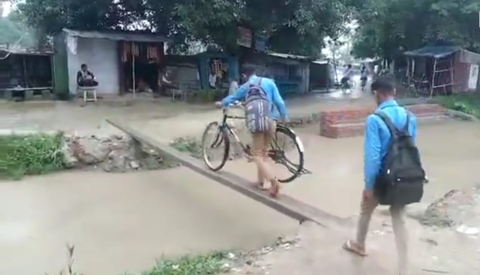 नहर विभाग और सम्बंधित ठीकेदार की लापरवाही के चलते जान जोखिम में डालकर पोल के सहारे नहर पार करते स्कूली बच्चे
