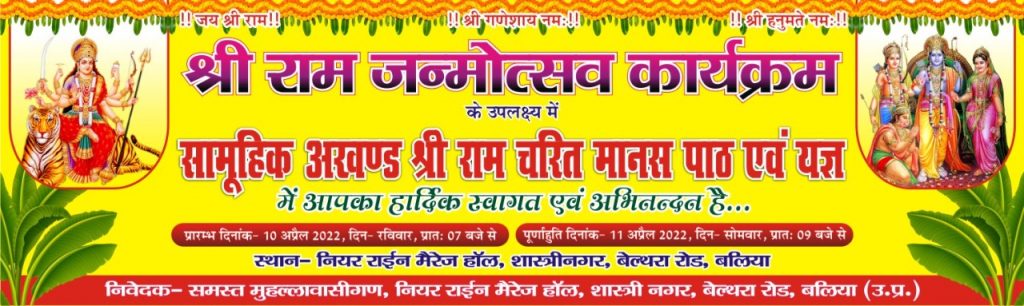 बिल्थरारोड। नगर के बस स्टेशन रोड पर राईन मैरेज हाल के समीप मुहल्ले वासियों द्वारा रविवार को रामनवमी के अवसर पर श्रीराम जन्मोत्सव कार्यक्रम के उपलक्ष्य में अखण्ड श्रीरामचरितमानस पाठ एवं यज्ञ का आयोजन किया गया है। रामचरित मानस के समापन के उपरांत सोमवार को भव्य भण्डारे का आयोजन किया जायेगा जिसमे सैकड़ो श्रद्धालु प्रसाद ग्रहण करेंगे। उक्त कार्यक्रम में समिति द्वारा लोगो से अधिक से अधिक भाग लेने की अपील किया गया है।
