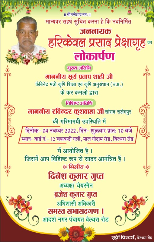 बिल्थरारोड। प्रदेश सरकार के कैबिनेट मंत्री सूर्यप्रताप शाही शुक्रवार को नगर के वार्ड नम्बर 12 में पूर्व सांसद हरिकेवल कुशवाहा के स्मृति में बने प्रेक्षागृह का लोकार्पण करेंगे। नगर पंचायत चेयरमैन दिनेश कुमार गुप्त के देखरेख में भव्य लोकार्पण कार्यक्रम का आयोजन किया गया है। प्रेक्षागृह का निर्माण नगर पंचायत के द्वारा कराया गया है। नगर के वार्ड नम्बर 12 के मालगोदाम रोड स्थित चकबन्दी गली में निर्मित प्रेक्षागृह नगर का इकलौता आडिटोरियम है। वही इस कार्यक्रम के विशिष्ट अतिथि पूर्व सांसद स्व0 हरिकेवल प्रसाद के पुत्र व सलेमपुर सांसद रविन्द्र कुशवाहा होंगे। इसकी जानकारी नगर चेयरमैन दिनेश कुमार गुप्त व अधिशासी अधिकारी ब्रजेश गुप्त ने दी। नगर चेयरमैन ने लोगो से इस लोकार्पण कार्यक्रम में अधिक से अधिक संख्या में पहुँचने की अपील की है।