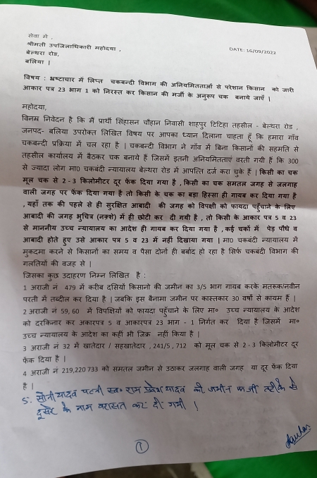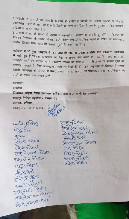 बिल्थरारोड। स्थानीय तहसील के चकबन्दी विभाग में व्याप्त भ्रष्टाचार , काश्तकारों का खेत इधर – उधर करके एसीओ, कानूनगो और लेखपाल द्वारा किये जा रहे आर्थिक शोषण करने का सिलसिला थमने का नाम नही ले रहा है। क्षेत्र के शाहपुर टिटिहा में लगभग 300 काश्तकारों का खेत चकबन्दी विभाग के द्वारा इधर उधर कर दिया गया है। जिसको लेकर अधिकार सेना के जिला उपाध्यक्ष सिंहासन चौहान के नेतृत्व में सैकड़ो काश्तकारों ने शुक्रवार को चकबंदी अधिकारी शिवशंकर सिंह को शिकायती पत्र दिया। दिए गए शिकायती पत्र में उल्लेख किया गया है कि बेल्थरारोड तहसील में चकबन्दी विभाग के अधिकारियों और कर्मचारियों द्वारा जमकर उच्च न्यायालय के नियम का उल्लंघन किया जा रहा है। काश्तकारों के चकाउट की जमीन को पोखरी में नम्बर कर दिया गया है। सह खातेदार के खेत को एक किलोमीटर दूर फेक दिया गया है। चकाऊट की जमीन और आबादी की जमीन के नम्बर को दूसरे के नाम चढ़ा दिया गया है। जबकि यह जमीन चकबन्दी प्रक्रिया से बाहर होती है। सोनी देवी पत्नी स्व रामप्रवेश यादव की जमीन फर्जी तरीके से दूसरे के नाम कर दिया गया है। जिसके चलते काश्तकार दर- दर की ठोकरें खा रहा है। साथ ही काश्तकारों के खेत को नियम के विरुद्ध इधर – उधर करके एसीओ, कानूनगों ज्ञानेश श्रीवास्तव , और लेखपाल द्वारा जमकर काश्तकारों से आर्थिक शोषण किया जा रहा है। जबकि नियम के अनुसार चकनाली, रोड, ग्रामसमाज की जमीन की कटौती ही करना है। किसी काश्तकार के खेत को इधर उधर उसके बिना मर्जी के नही करना है। इसके बाद भी बेल्थरारोड चकबन्दी विभाग मे व्याप्त भ्रष्टाचार रुकने का नाम नही ले रहा है। अधिकार सेना के जिला उपाध्यक्ष सिंहासन चौहान ने कहा कि जिन भ्रष्ट चकबन्दी अधिकारियों का पेट नही भर पाता हो तो उनके लिए हम चन्दा एकत्रित करके उन्हें देंगे। काश्तकारों ने एक डिब्बे में तहसील में लोगो से चंदा इकट्ठा किया कहा कि और चन्दा इकट्ठा करके मुख्यमंत्री कार्यालय में जमा करेंगे । कहा कि पूर्व में यहाँ के चकबन्दी विभाग के सीओ घुस मांगने के वायरल वीडियो को लेकर निलंबित हुए है। इसके बाद भी चकबन्दी विभाग में भ्रष्टाचार थमने का नाम नही ले रहा है। उन्होंने पत्र देकर मांग किया कि भ्रष्ट अधिकारियों के अनियमितता के चलते काश्तकार परेशान है। कहा कि प्रपत्र 23 को निरस्त कर किसान की मर्जी के अनुरूप चक बनाया जाय। चकबन्दी विभाग द्वारा काश्तकारों के साथ हो रही नाइंसाफी को लेकर अधिकार सेना ने शाहपुर टिटिहा के काश्तकारों तहसील परिसर में एक दिवसीय धरना प्रदर्शन किया गया। इस मौके पर राजू चौहान, सोनी यादव, पुष्पा, मंजू सिंह, रामकेवल चौहान, राहुल चौहान, लीलावती, अमित, लक्ष्मी यादव, श्रीराम यादव, ओमप्रकाश चौहान, गोवर्धन, यशविंद्