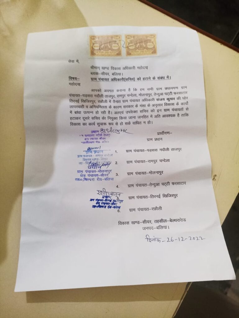 बिल्थरारोड। विकास खण्ड सीयर में कार्यरत ग्राम पंचायत अधिकारी संजय कुमार के रवैये से क्षुब्ध उनसे सम्बंधित ग्राम प्रधानों ने खण्ड विकास अधिकारी सीयर मधुछन्दा सिंह को सोमवार को पत्र देकर हटाने का मांग किया है। दिए गए पत्र में ग्राम प्रधानों ने उल्लेख किया है कि ग्राम पंचायत अधिकारी संजय कुमार की अनियमितता और लापरवाही के कारण ग्राम सभा का विकास कार्य सरकार की मंशा के अनुरूप नही हो पा रहा है। इसलिए सचिव संजय कुमार को जनहित में तत्काल हटाया जाय और दूसरे की नियुक्ति किया जाय, जिससे गांव का विकास कार्य सरकार की मंशा के अनुरूप सुचारू रूप से हो सके। दिए गए पत्र में ग्राम पंचायत तिरनई खिजिरपुर, पड्सरा नदौली ताजपुर, रछौली, रामपुर चंदेला, मोलनापुर, तेंदुआ पट्टी फारसाटार के ग्राम प्रधान हस्ताक्षर किए है।